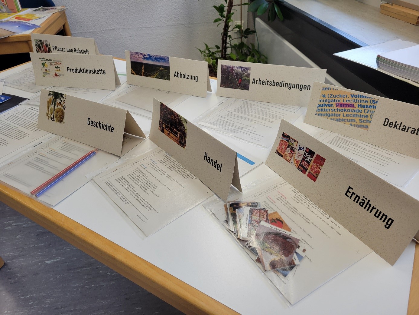 Die Arbeitsmaterialien umfassen Themen wie die Herkunft der Ölpalme, ihre Verwendung (Biodiesel, Kosmetik, Nahrungsmittel), die Zerstörung des Regenwaldes und Handlungsoptionen für Verbraucher.